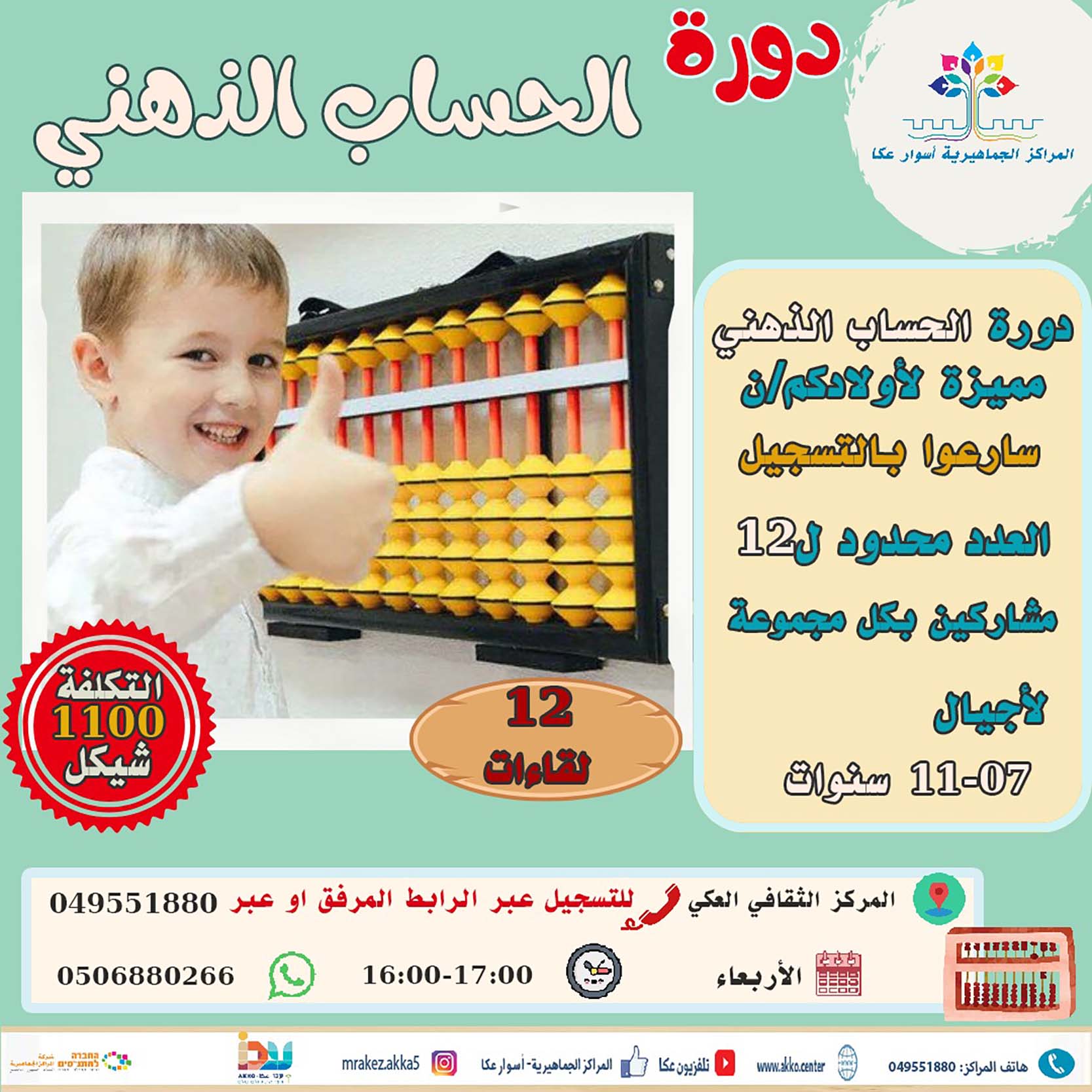 تعلن المراكز الجماهيرية أسوار عكا عن فتح باب التسجيل لدورة اخرى في الحساب الذهني للأطفال من جيل 07-11 سنوات، التي ستقام في المركز الثقافي العكي، يوم اربعاء، عند الساعة 16:00، ومن خلالها يتدرب الأطفال على مهارة الحساب السريع الذي يعتمد على الابداع والسرعة أيضًا، والتعرف على أساسيات الحساب الذهني.
