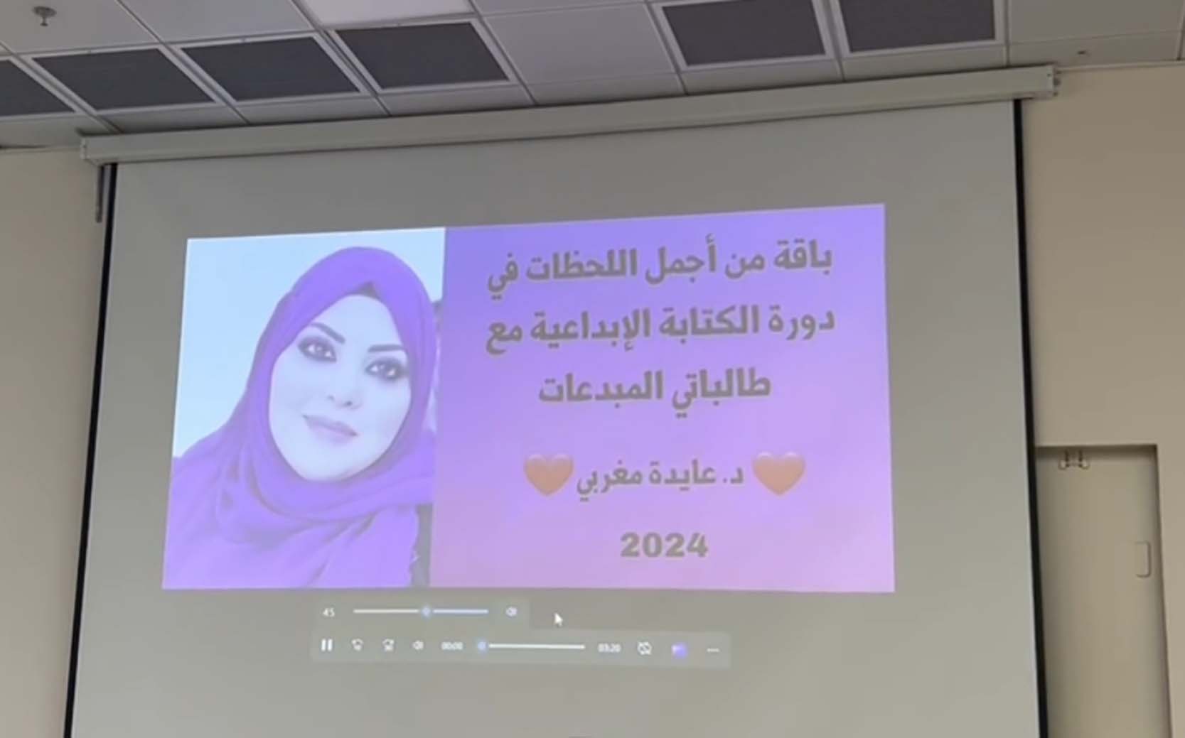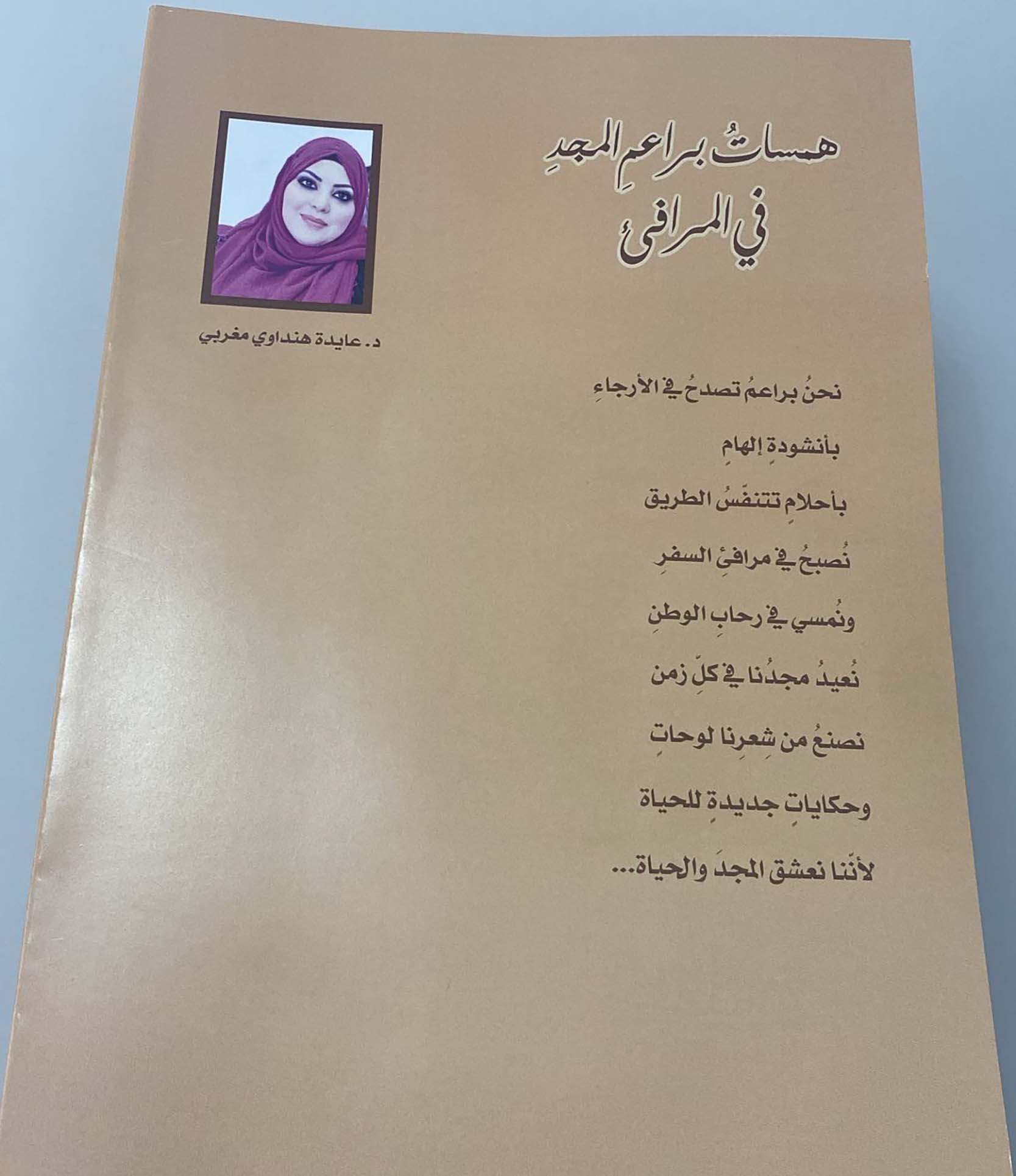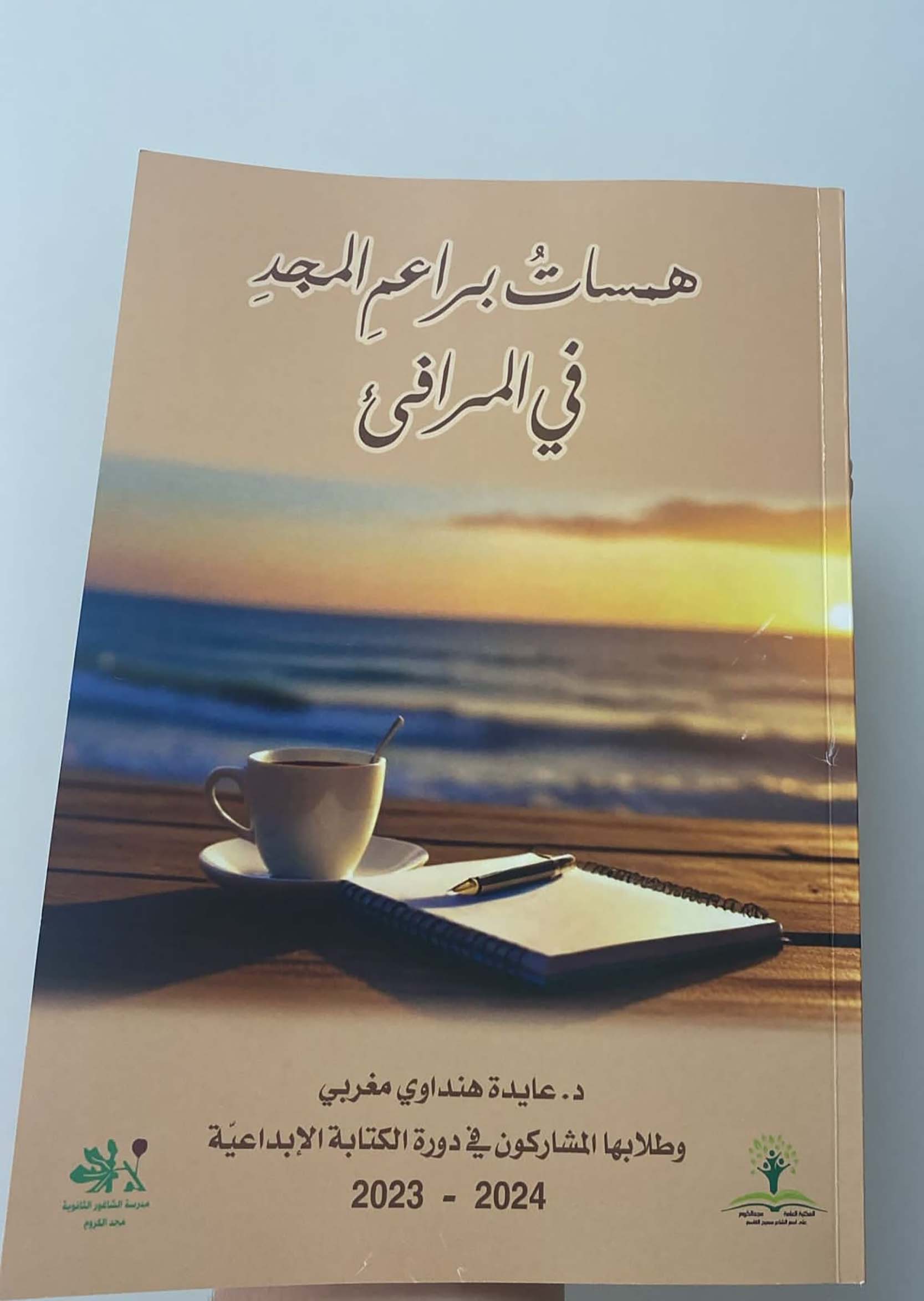 كل التحيّة والشكر والتقدير للأديبة المبدعة د. عايدة هنداوي مغربي على نجاحها في تعليم الدورة للطالبات، بأسلوب شيّق ومميز أكسبهن عدة أدوات ومهارات كتابية إبداعية. وثمرة النجاح جاءت على هيئة كتاب الدورة وهو بعنوان “همسات براعم المجد في المرافئ” الذي يحوي نصوصًا شعرية ونثرية أبدعت الطالبات بكتابتها بتوجيه من الشاعرة عايدة مغربي، كما ويحوي الكتاب على القصيدة المشتركة التي كتبتها هي وطالباتها في الدورة والتي تحمل نفس عنوان الكتاب. ويحتوي الكتاب أيضا على باقة صور لأجمل ذكريات دورات الكتابة الإبداعية.