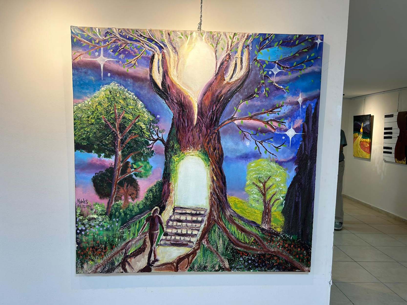 وعن لوحة “شجرة النور” قالت الفنانة ملك صايغ “ان حجم اللوحة متر مربع، عملت على إعدادها لمدة سنة ونصف تقريبا، وأدخلت فيها مادة الجبص لتكون بارزة، واللوحة تحمل معان روحية وتعبر عن الطريق الى نور الخالق او الى الحياة الأبدية”.
