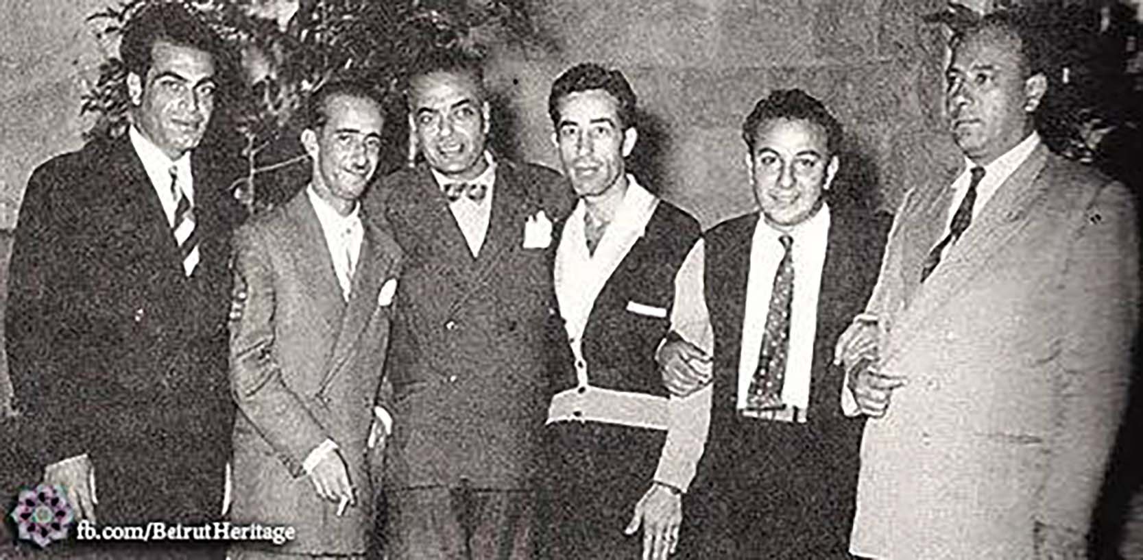من الشمال لليمين: عبد الكريم قزموز، الملحن العريق محمد القصبجي اشهر واهم من لحن لام كلثوم، زكريا احمد احد العمالقة اهم من لحن اجمل اغاني ام كلثوم، عبود عبد العال عازف الكمان، جنبه عاصي الرحباني زوج فيروز، محمد فتوح ملحن مهم زوج سعاد محمد المطربة العظيمة