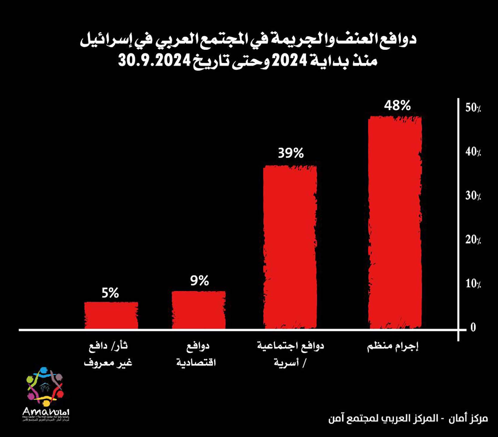 ويتعمّق التقرير في تحليل دوافع الجريمة في المجتمع العربي، حيث تشير معطيات مركز أمان إلى أن 48% من الجرائم تعود إلى دوافع الإجرام المنظم، في حين أن 39% من الجرائم ترتبط بخلافات اجتماعية أسرية، و9% بدوافع اقتصادية، و5% بدوافع ثأر أو لم يعرف الدافع وراءها.