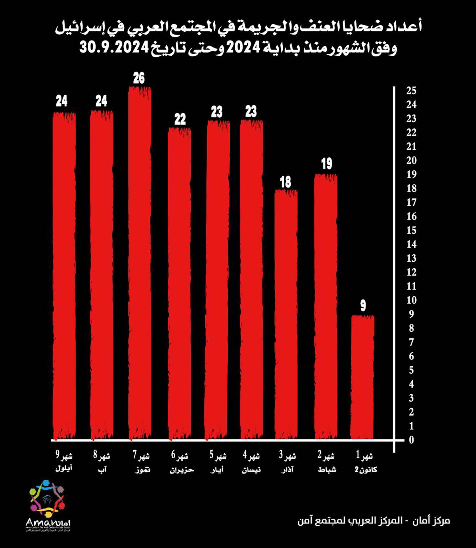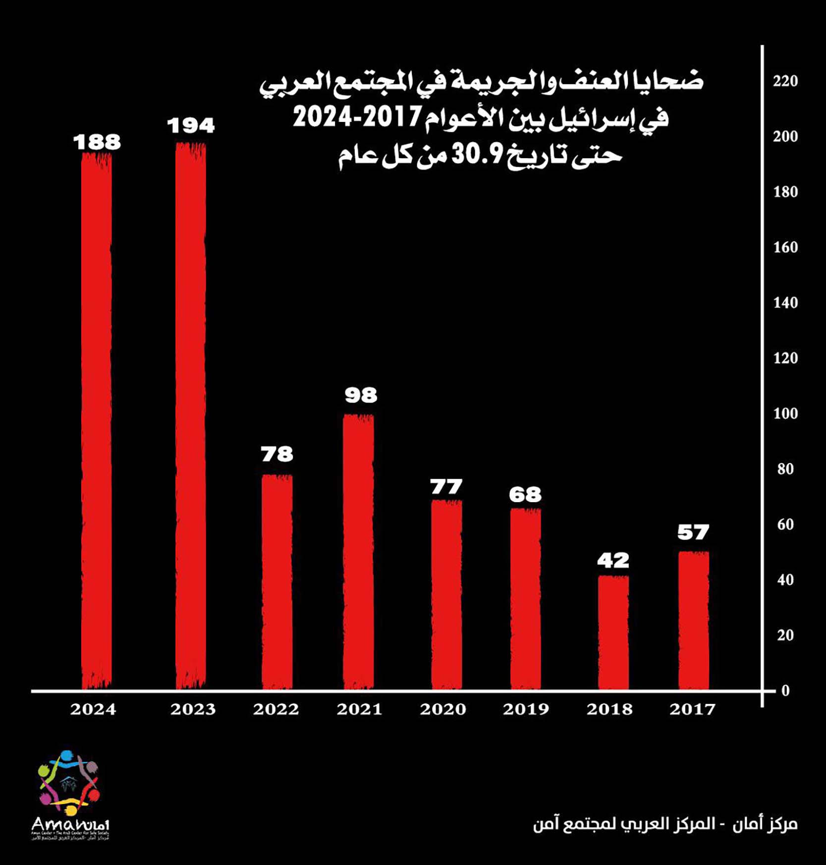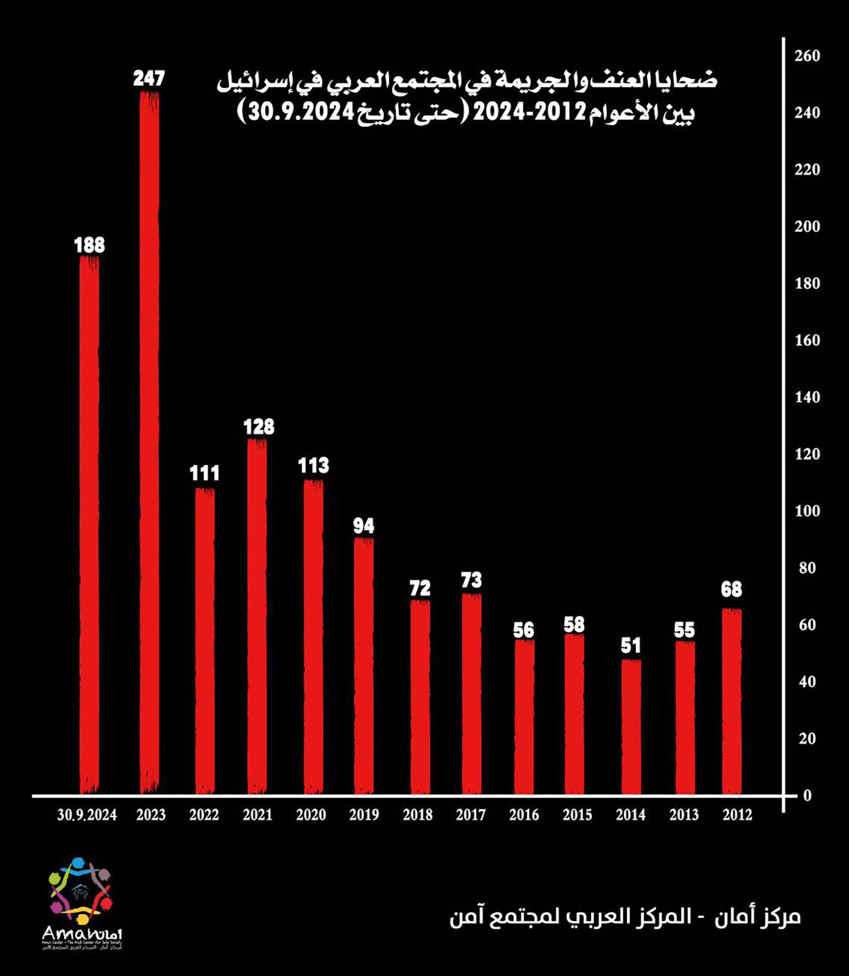 أصدر مركز أمان- المركز العربي لمجتمع آمن، تقريرًا دوريًّا مع انتهاء الربع الثالث من العام 2024 حول أعداد ضحايا العنف والجريمة في المجتمع العربي في إسرائيل، حيث بلغ عدد الضحايا العرب 188 ضحية منذ بداية العام وحتى تاريخ 30.9.2024، مقارنة بـ 194 ضحية في نفس الفترة من العام الماضي 2023، و78 ضحية في نفس الفترة من العام 2022.