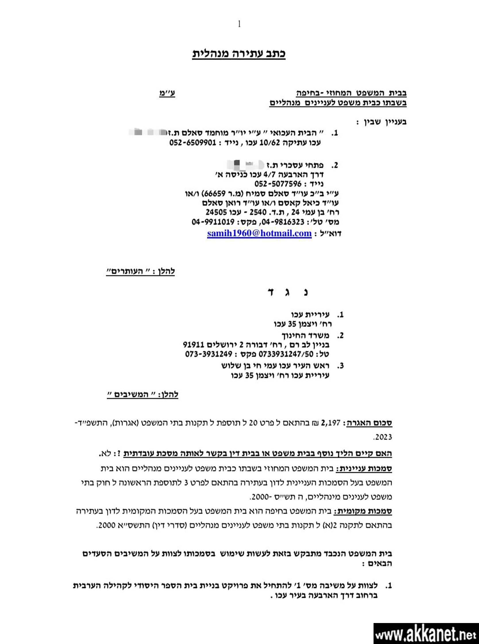 تقدمنا اليوم التماساً للمحكمة المركزية في حيفا نطالب من خلاله بإصدار قرار يلزم البلدية بالبدء فورا باتخاذ الإجراءات اللازمة للبدء في بناء المدرسة الجديدة خصوصا وان وزارة المعارف قد اقرت الميزانيات المطلوبة، وتم استصدار التراخيص اللازمة، ولم يبق الا التعاقد من المقاول من اجل بدء التنفيذ… بهذه المناسبة، نسجل اسمى آيات الشكر للدكتور المحامي سميح سالم على تجنده لخدمة هذا الملف، واستعداده اللامحدود في سبيل الدفاع عن هذه القضية المشروعة حتى يتحقق الهدف.