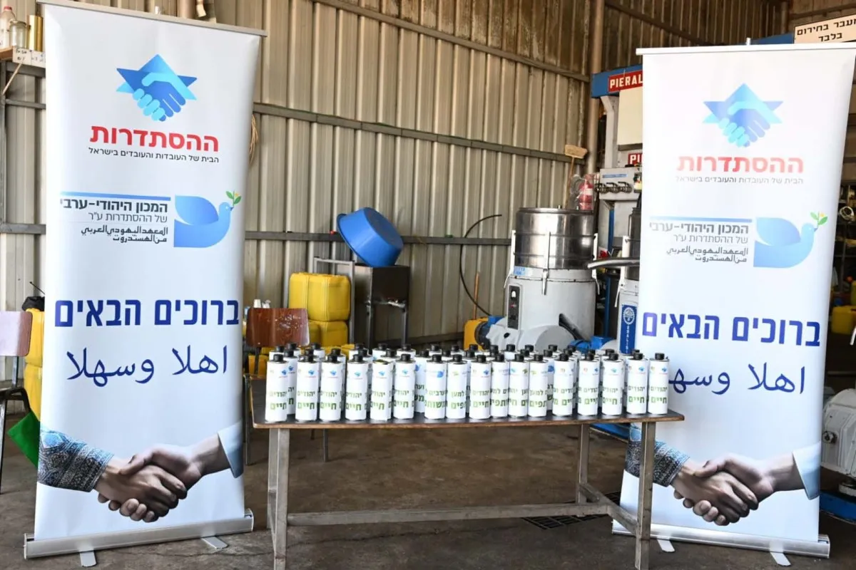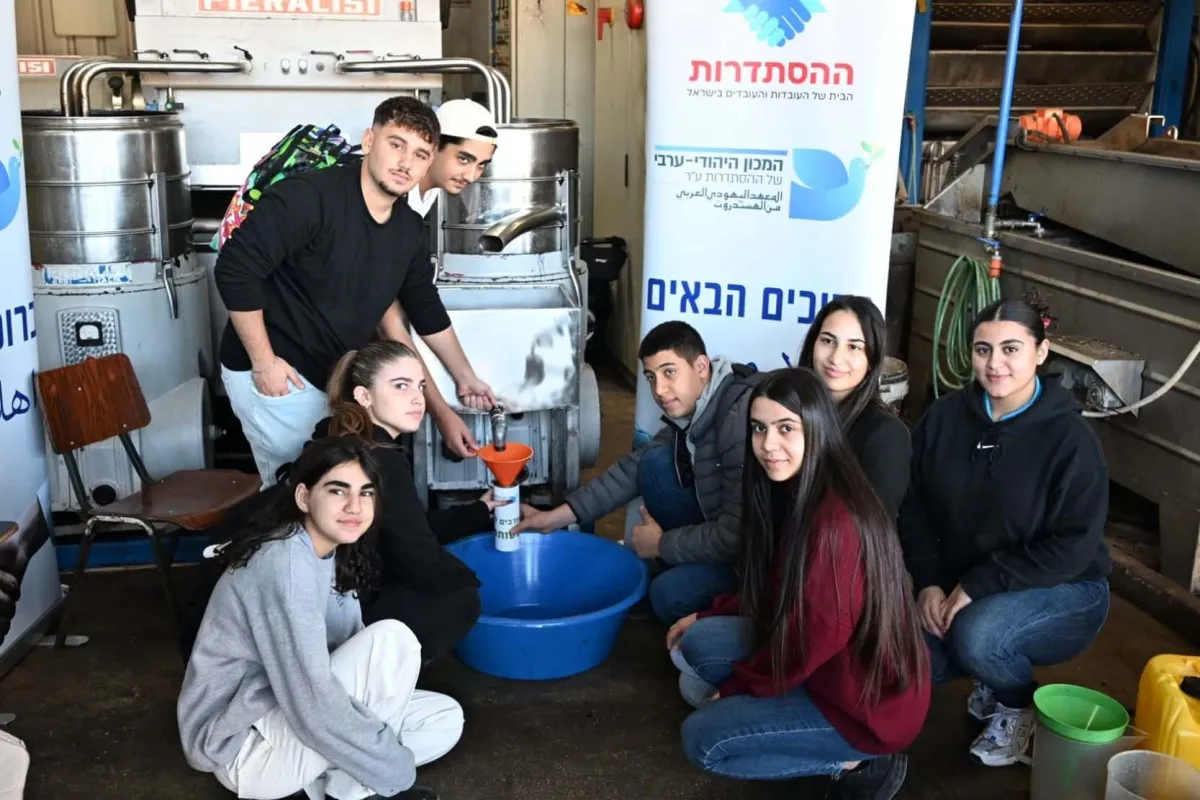 -بعدها ، التوجه لمعصرة الزيتون بإدارة السيد رائد حسين، حيث استقبلتنا عائلة رائد حسين القيّمة على المعصرة، وكذلك מנהל ענף הזית , حيث تعرف الطلاب على مراحل عصر الزيتون من بدايته وحتى مرحلة استخلاص الزيت وتعبئته، وفي النهاية شارك الطلاب من كلتا المدرستَين في مرحلة تعبئة الزيت في الزجاجات