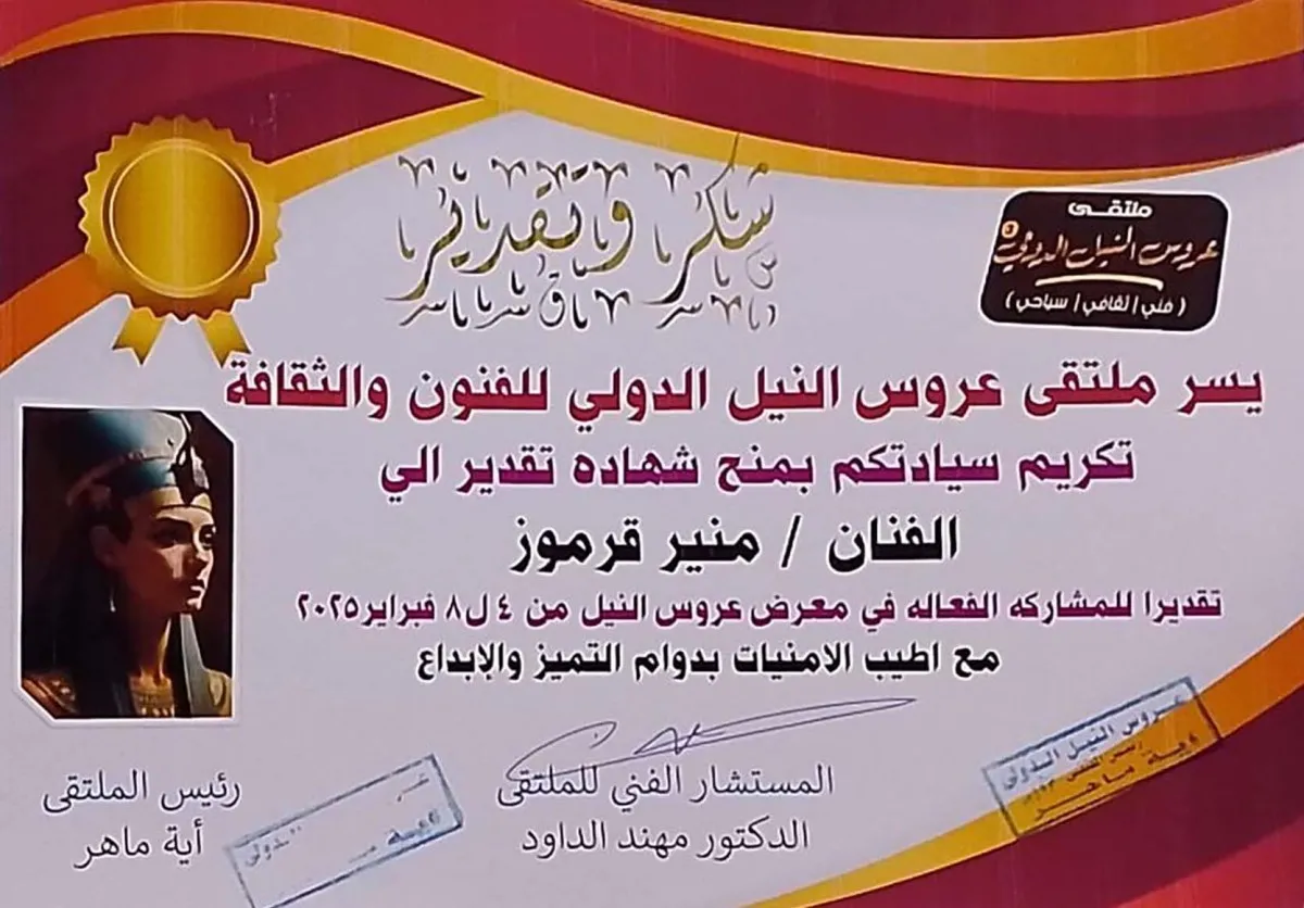 شارك مؤخرا الفنان التشكيلي العكي منير قزموز في “ملتقى عروس النيل الدولي الثالث” للفن التشكيلي في الاقصر بمصر بمشاركة عشرات الفنانين من عدة دول عربيه.