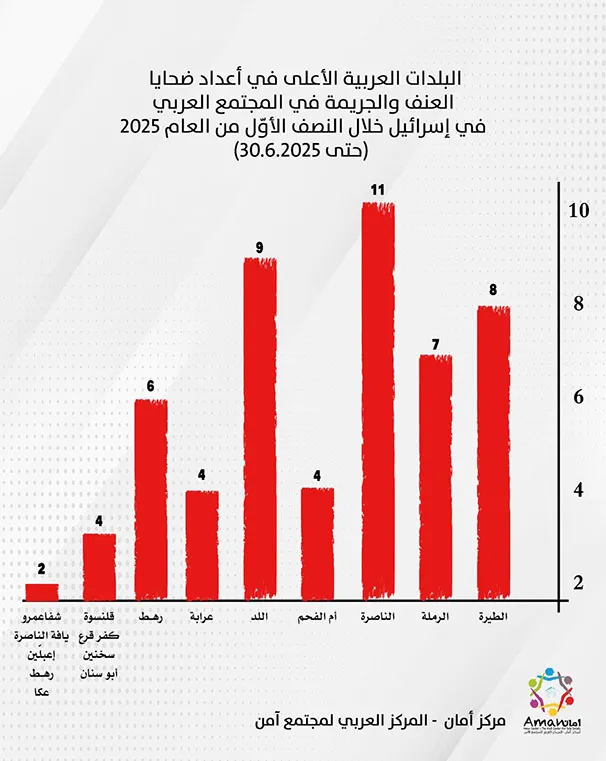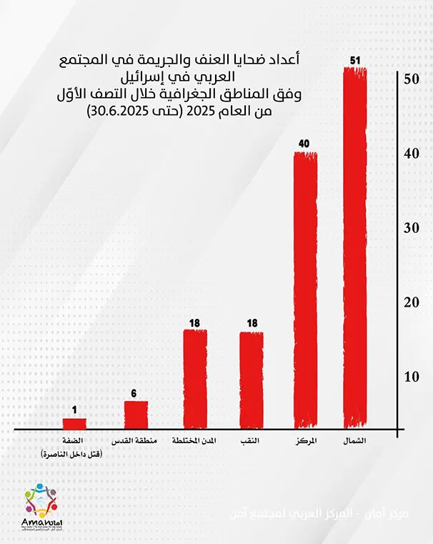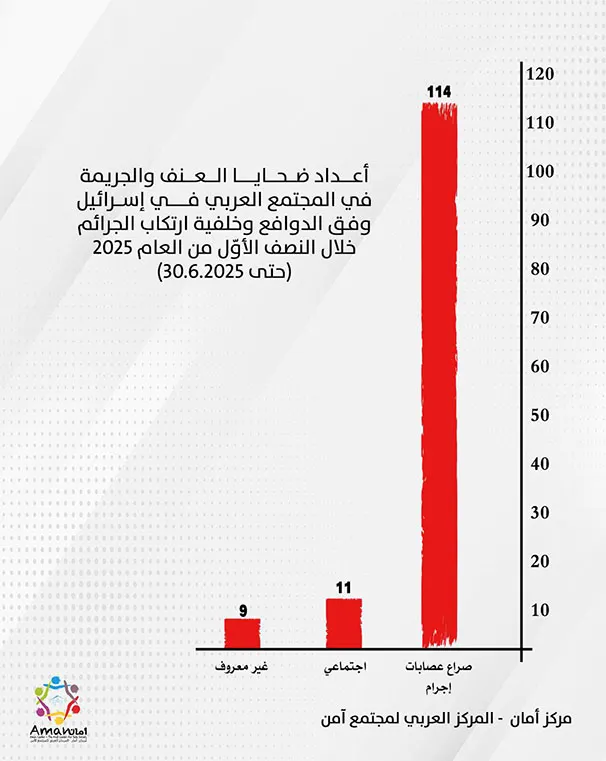 – عدد ضحايا العنف والجريمة في المجتمع العربي حتى النصف من عام 2025 بلغ 134 ضحية، وحتى نصف 2024 بلغ 114 ضحية، حتى نصف 2023 بلغ 111، حتى نصف 2022 بلغ 44، حتى نصف 2021 بلغ 57، حتى نصف 2020 بلغ 47.