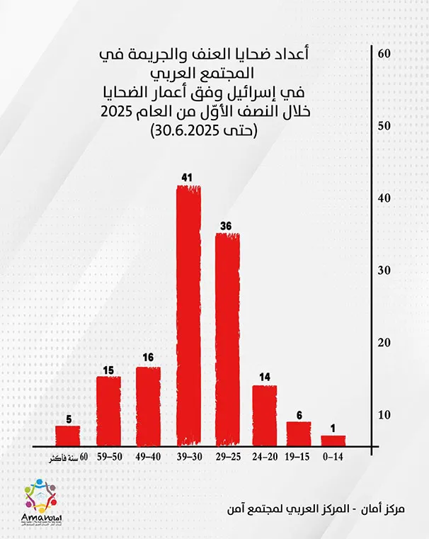 تُظهر بيانات مركز أمان أنّ الفئة العمرية الأكثر استهدافًا هي فئة الشباب بين 25–39 عامًا، إذ بلغ عدد الضحايا في هذه الفئة 77 من أصل 134، أي نحو 58%. وتوزعت الأرقام كما يلي: 30–39 سنة: 41 ضحية، و25–29 سنة: 36 ضحية. يلي ذلك فئة 40–49 سنة (16 ضحية)، ثم 50–59 سنة (15)، و20–24 سنة (14). كما قُتل 6 مراهقين أعمارهم بين 15–19 عامًا، و5 أشخاص فوق سن الستين، وضحية واحدة دون سن 14 عامًا.