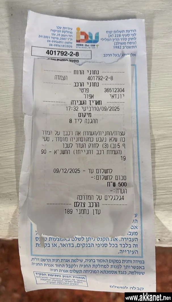 وجاء في رسالتها: “في تاريخ 9/10/2025، أوقفتُ سيارتي في مكانٍ مُنع فيه الوقوف، حسب ادعاء مراقب البلدية، ومن المهم أن أؤكد هنا: يعيش والداي في حي ههجاناه منذ حوالي 30 عامًا، وكنتُ أركن سيارتي دائمًا في نفس المكان دون إزعاج أحد وهي منطقة بعيدة لا يوجد فيها مارة ولا تضايق على احد، ففي منطقتي، تُسجل مخالفات الوقوف بشكل متكرر وصارم، ومن ناحية أخرى، لديّ صور واضحة من شارع بوروخوف، وأحد هعام، حيث تُركن العديد من المركبات بانتظام على الأرصفة وفي الأماكن الممنوعة، دون تسجيل أي مخالفات لها.