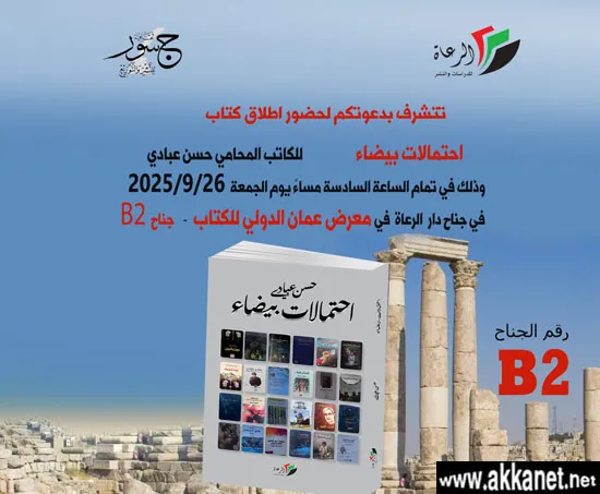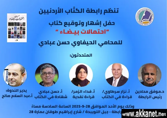 وقع الكاتب المحامي الحيفاوي حسن عبادي كتابه الجديد “احتمالات بيضاء–قراءات في أدب الحرية الفلسطيني” على منصة التوقيع في أروقة معرض الكتاب الدولي في عمان، وذلك يوم الجمعة 26/9/2025، ليتبع ذلك احتفاليتان مستقلتان لإشهار الكتاب، حضرهما جمع من الكتاب والمثقفين والمهتمين بأدب الحريّة، كانت الأولى في مقر رابطة الكتاب الأردنيين في إربد يوم السبت 27/9/2025، شارك فيها نخبة من الكتاب والأدباء، بالإضافة إلى عريف الحفل الروائي محمد مجدلاوي، مرحبا بالضيوف، ومعرّفا بالكتاب.