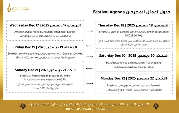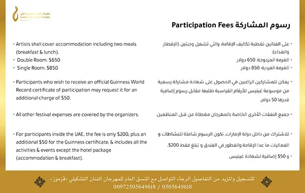 للتسجيل والمزيد من التفاصيل حول مهرجان دبي الدولي، الرجاء التواصل عبر الهاتف او الواتس أب مع الفنان “قزموز” على هاتف رقم: 0505649618 / 00972505649618