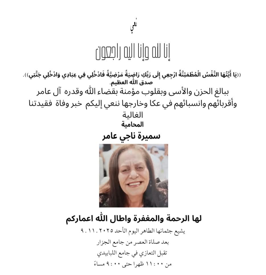 انتقلت الى رحمته تعالى المحامية سميرة ناجي عامر من عكا .