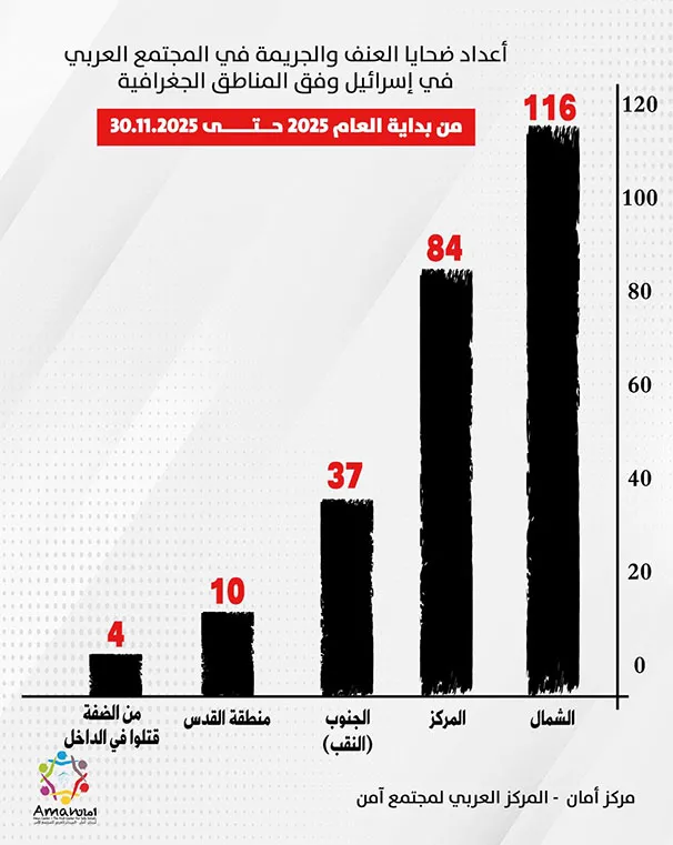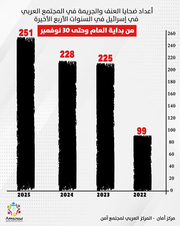 تقرير مركز أمان حول جرائم العنف: 251 ضحية حتى نهاية نوفمبر – أعلى من الرقم القياسي السنوي لعام 2023 (247 ضحية)