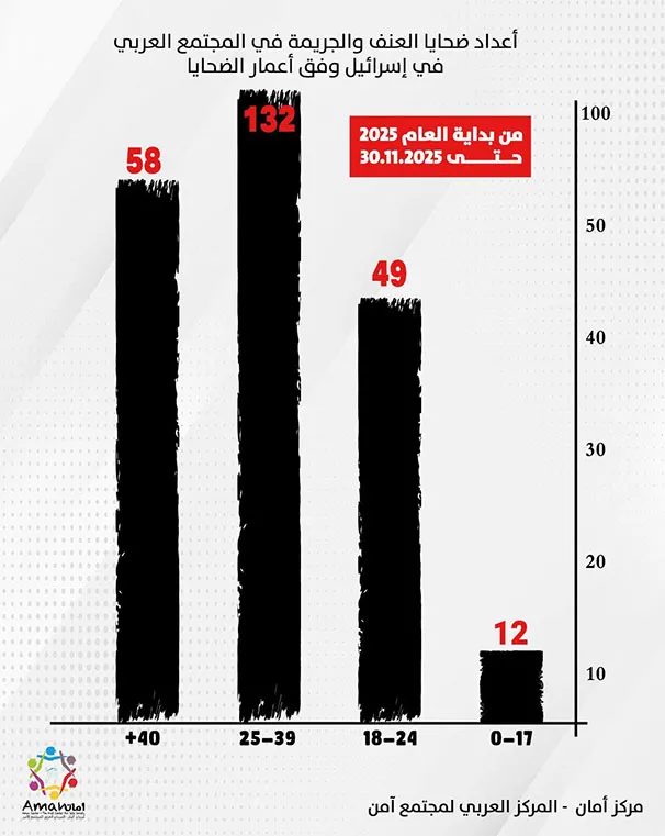 ووفقاً لتقرير مركز أمان حول ضحايا جرائم القتل لهذا العام حتى نهاية نوفمبر، فقد سُجل ارتفاع لافت في جرائم قتل القاصرين، إذ بلغ عدد ضحايا الأطفال واليافعين دون سن 17 عاماً 12 ضحية، في مؤشر واضح على اتساع دائرة العنف نحو فئات يفترض أن تكون الأكثر حماية. ويرى مركز أمان معدّ التقرير أن هذا التطور يعكس بشكل واضح تفكك المنظومة الوقائية وتراجع الشعور بالأمان في البلدات العربية.