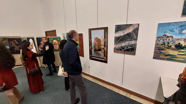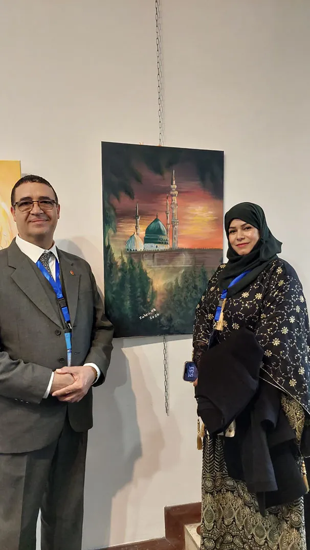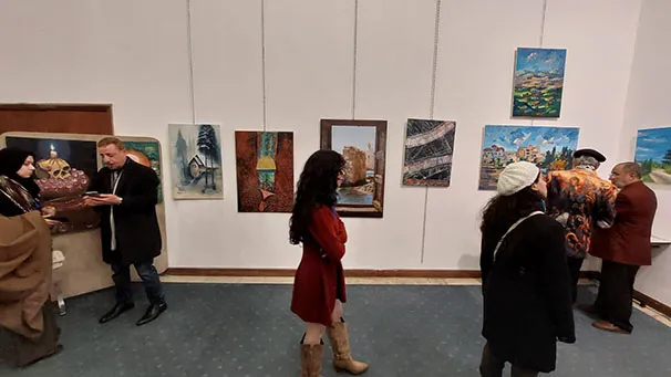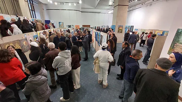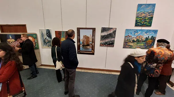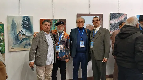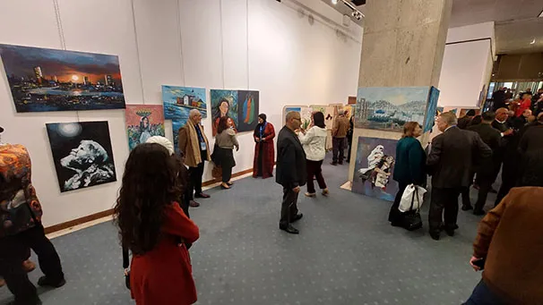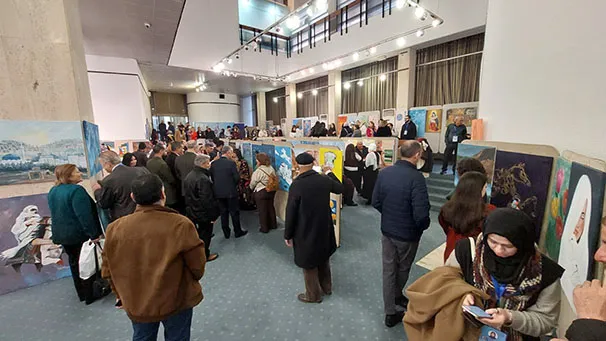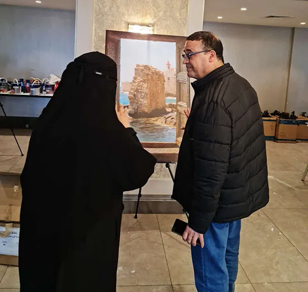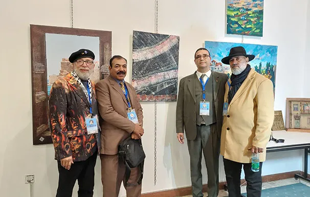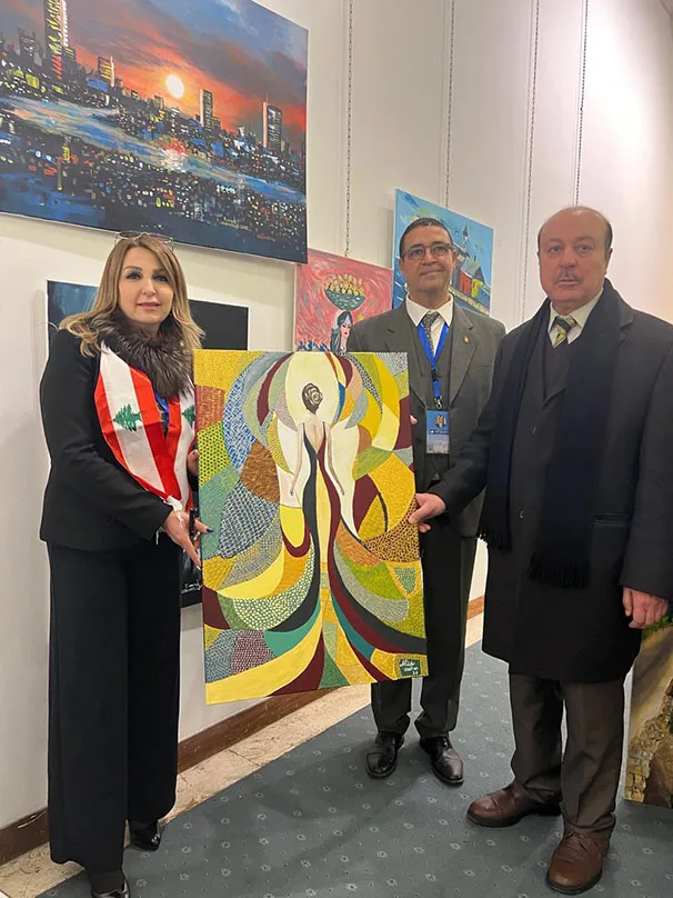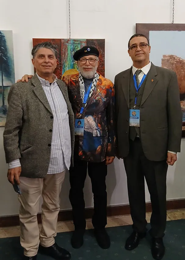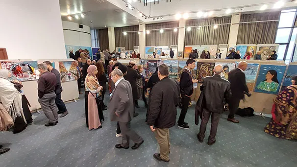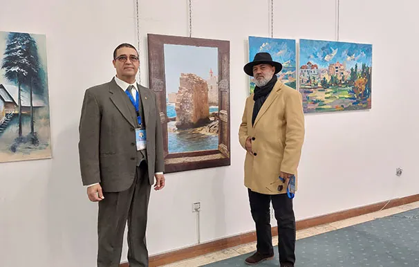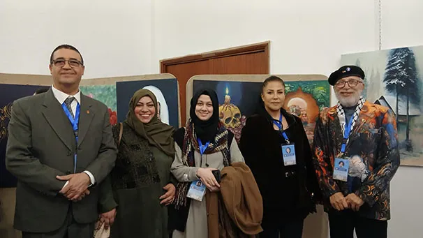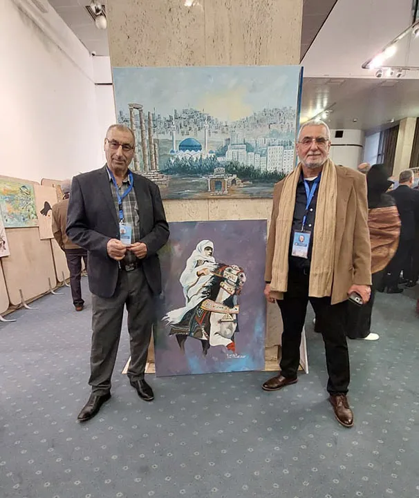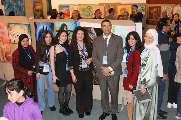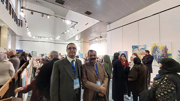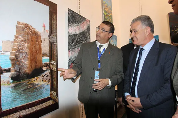وجال الأحمد يرافقه النائب عبدالباسط الكباريتي ورئيس الجمعية علي كريشان، على اللوحات الفنية بالمعرض الذي شارك في أعماله 130 تشكيليا وتشكيلية يمثلون 14 دولة عربية شقيقة وأجنبية صديقة، من الأردن وفلسطين، وسوريا ولبنان ومصر والسعودية والكويت والبحرين وليبيا والجزائر والمغرب، وأذربيجان وروسيا وأوكرانيا.