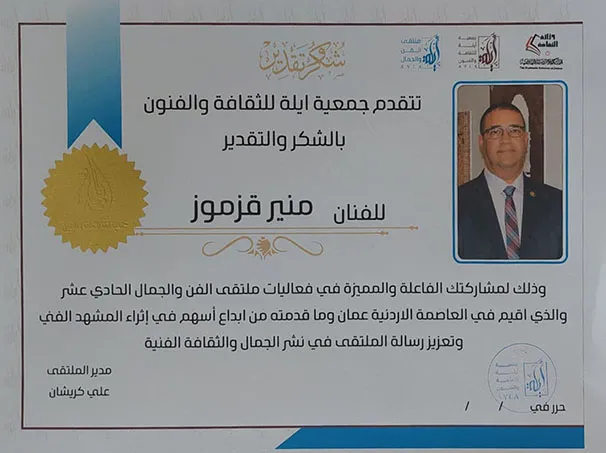 تم مؤخرا تكريم الفنان الفلسطيني قزموز من قبل وزارة الثقافة الأردنية وجمعية آيلة للثقافة والفنون، في ختام المهرجان الدولي للفن التشكيلي “ملتقى الفن والجمال الحادي عشر” الذي اقيم في القصر الملكي بمدينة عمان.