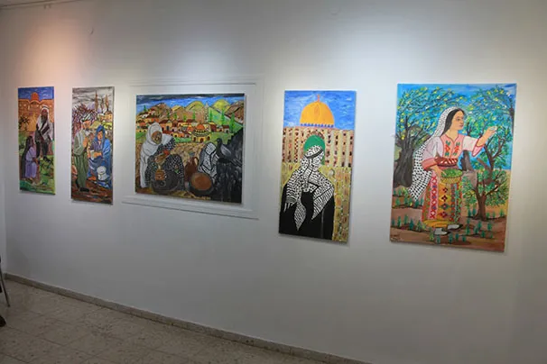 في معرضه هذا ألوان وعبر كل لوحة تحاكي موضوعا تاريخيا فيه الحنين وفيه الجمال وفيه حب الوطن كلوحة ” اعشقك يافا ” والهجرة والتهجير وصرخة غضب بالأسود والأبيض. من خلال المعرض نجد لوحات من المدرسة التكعيبية تحاكي عمالقة الفن العالمي أمثال بابلو بيكاسو الذي تأثر الفنان بأسلوبه بلوحة تجسد شخصية انسان على شكل حيوان مفترس متوحش عدائي يحاول الاعتداء على فتاة لتستل خنجرا وتطعنه دفاعا عن شرفها.