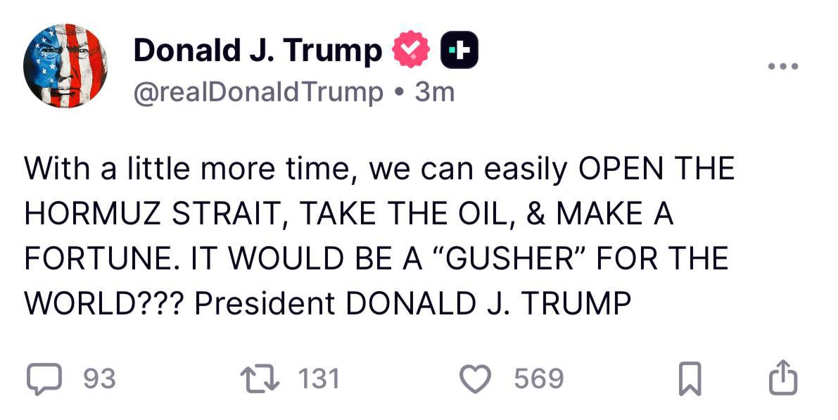 وكتب ترامب في منشور عبر منصته “تروث سوشيال” أن القليل من الوقت الإضافي سيمكن أمريكا من فتح المضيق الاستراتيجي وأخذ النفط وتحقيق ثروة، متسائلا ساخرا عما إذا كان ذلك سيكون “نبعا” للعالم.