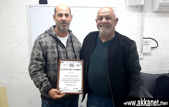 في نهاية اللقاء تم تسليم ابو خضره شهادة شكر وتقدير حيث ياتي هذا اللقاء ضمن حملة انت بالبال التي اطلقها منتدى الرجال العكي بهدف تسليط الضوء على أُناس كان لهم الاثر والبصمه في حياتنا قبل عقود من الزمن ومنحهم الشعور بأنهم ما زالوا في ذاكرتنا ويشرفنا اعطائهم منصه للتعبير عن انفسهم من خلال لقاء ودي في المنتدى.