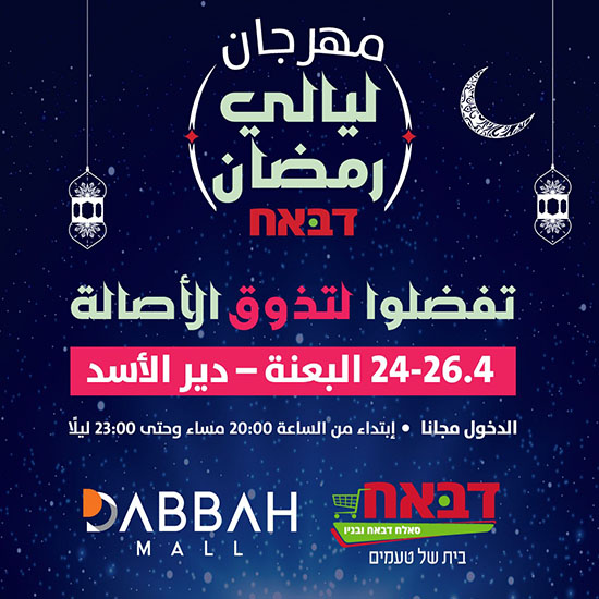 برنامج وفعاليات مهرجان “ليالي رمضان” في “ذباح مول” هذه السنة غنية بالفعاليات لجميع أفراد العائلة من فعاليات ترفيهية, مسرحيات للأطفال, أكشاك الطعام وجميع انواع الحلويات (كنافة, بقلاوة, قطايف وعوامة) والعديد من المفاجآت الأخرى على مدار ثلاث ليالي متواصلة.
