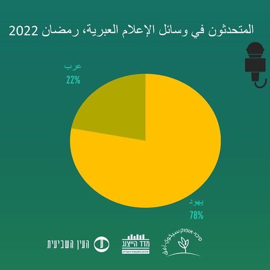 كما وبيّن الفحص أن %78 من المضامين الإعلامية التي تم فحصها ضمت متحدثا يهوديًا بالأساس، وفي عدد قليل جدًا من المضامين(%22)، كانت هناك مشاركة لمتحدث/ة عربي/ة. وقد شمل البحث القنوات العبرية 12 و13 و”كان” 11، الاذاعات “كان ب” و “جالي تساهل”، الصحف ” يديعوت احرونوت”، “يسرائيل هيوم”، “معاريف”وهآرتس” والمواقع “واينت”، “والاه” و”ماكو”.