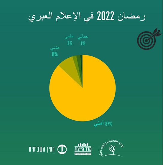 فقد وجد الفحص الذي أجرته شركة “يفعات” للأبحاث الاعلامية، قبل بداية الشهر الفضيل بأسبوعين حتى نهايته، أن %87 من المضامين الإعلامية هذه السنة حول شهر رمضان وُضعت ضمن إطار أمني وربطت هذا الشهر بالإرهاب، و%89 من التغطية كانت سلبية-تم تصويره كمصدر خطر وتهديد.