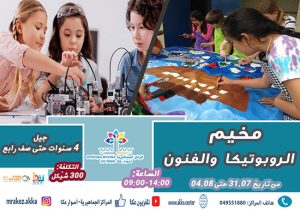 تُعلن المراكز الجماهيرية- أسوار عكا، عن فتح باب التسجيل لمخيم الروبوتيكا والفنون، لطلاب من جيل أربعة سنوات وحتى طلاب الصف الرابع، الذي يبدأ فعالياته من تاريخ 31.07.22 حتى 04.08.22.