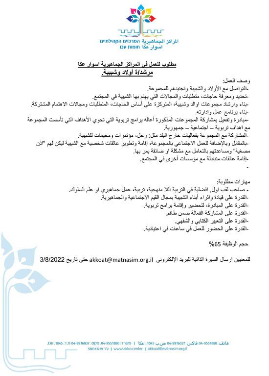 عكا… مطلوب للعمل في المراكز الجماهيريه اسوار عكا مرشد/ة اولاد وشبيبه