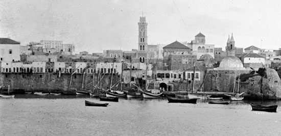 عكا… صوره قديمه لميناء عيسى العوام وتظهر جدران خان العمدان، بناية الجمرك وجامع الميناء