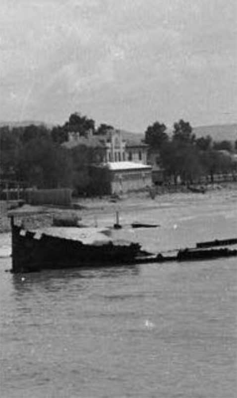 عكا… السفينه الحديديه الغارق على شاطئ العرب وفي الخلف محطة القطار العثمانيه