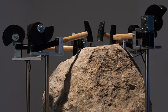 في داخل فضاء العرض يندمج صوت عرار مع طرقات مستمرّة، قادمة من الجزء الخلفيّ للجاليري، حيث تمّ نصب عمل شير هندلسمان: منحوتة حركيّة، مبنية من حجر جيريّ ثقيل رُكِّبتْ حولها مجموعة من المطارق التي تضرب الحجر بشكل متواصل، فتسرّع من عمليّة تفتّته وتُملي حركة الصوت في الفضاء. يسلك العمل بأكمله كأداة موسيقيّة مؤقّتة، ولكن أيضًا كنوع من ساعة، تضبط الوقت، ممّا يدلّ على فقدانه المستمرّ. كما هي الحال في أعمال هندلسمان الأخرى، هنا أيضًا يرتكز العمل على توليفة موسيقيّة كاملة، تحظى بتعبير صوتيّ-بصريّ متداخل.