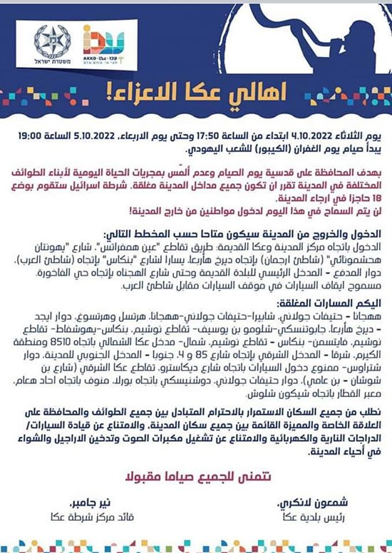 اغلقت الشرطة وموظفو البلديه في مدينة عكا منذ مساء يوم امس العديد من الشوارع امام المركبات بسبب يوم الغفران ومنعا للاحتكاكات بين العرب واليهود حسب ادعاءاتهم، ومن يصل الى المدينه يشعر بانه في ثكنه عسكريه مغلقه ومعظم الشوارم ممنوع السير فيها للمركبات.