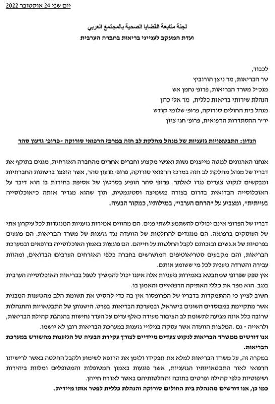 خلال حلقة انتخابية مع أييلت شاكيد في عومر أمس الأحد، قال البروفيسور جدعون ساهر، مدير قسم جراحة القلب في مستشفى سوروكا إنّ “ما يؤدّي لهزيمتنا [نحن الإسرائيليون] هو الولادة – أقصد الرّحم العربيّ”. وقد قوبلت تصريحات الطبيب العنصريّة بالغضب والاستهجان في خاصة في المجتمع العربي والنّقب وأيضًا من قبل معنيين بمجال الصحة في البلاد.