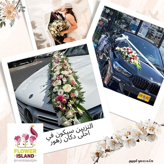 5 القصص الرومانسية سيفوزون ب تزيين لسيارة الزفاف من زهور “– flower island – اجمل محل زهور في – التزيين من محل flower island المتواجد في مول هاريم – نوف هجليل !