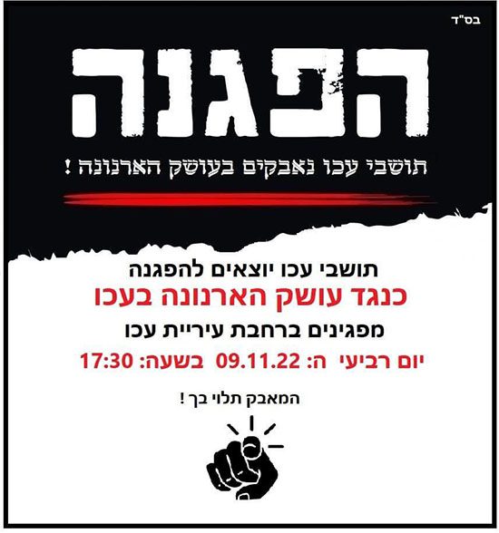 علم مراسل عكانت ان منظمي التوقيع على عريضه ضد رفع اسعار الارنونه “ضريبة الاملاك” اعلنوا مؤخرا عن مظاهرة امام مبنى البلديه يوم الاربعاء الموافق 9.11.2022 الساعة 17.30 والدعوة عامة.