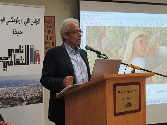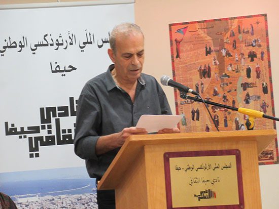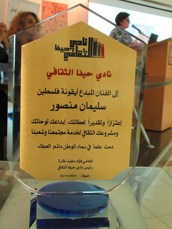 أقام نادي حيفا الثقافي يوم الخميس 03.11.2022 أمسية ثقافية لتكريم الفنان التشكيلي والنّحّات الفلسطيني سليمان منصور. افتتح الأمسية المحامي فؤاد نقارة بكلمة ترحيبية وكلمات شكر للمجلس الملّي الأرثوذكسي الوطني لرعايته الأمسية وللقيمين معه على نشاطات النادي.