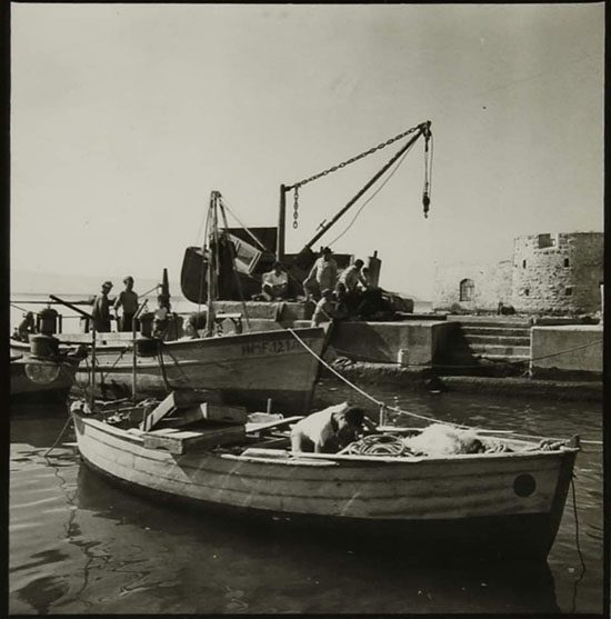 عكا… مركب وقارب صيد في ميناء عيسى العوام وفي الخلف بوابة البحر قبل بناء كاسر الامواج
