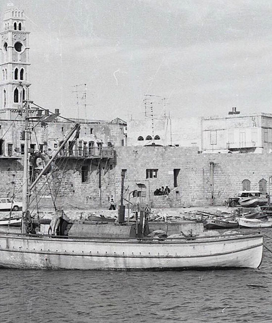 عكا… مراكب الصيد ترسو في ميناء عيسى العوام وفي الخلف برج الساعة فوق خان العمدان