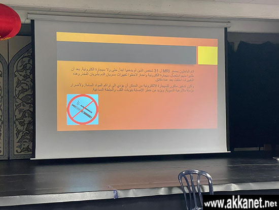 كما استعرض ما هي الاثار الصحية السلبية التي تسببها السجائر عامة على جسم الانسان مقارنة مع السجائر الالكترونية التي تضر أكثر بجسم الانسان التي من الممكن أن تؤدي الى تراكم المواد السامة، وأضرار مزمنة بالأوعية الدموية وتزيد من خطر الإصابة بنوبات قلبية وجلطة دماغية.