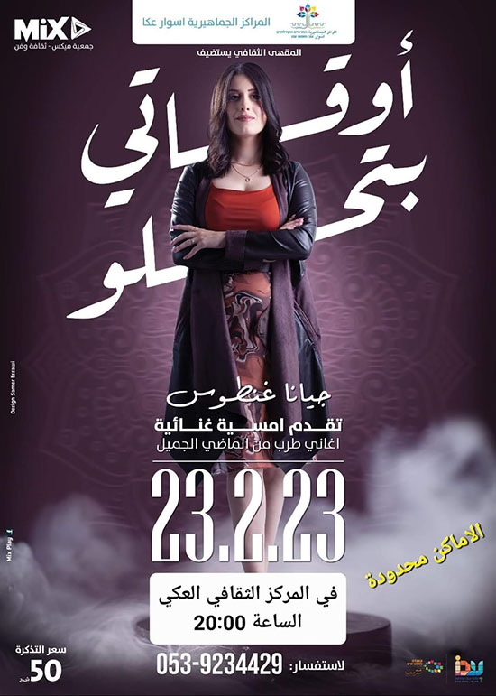 يسر المراكز الجماهيرية اسوار عكا دعوتكم لحضور عرض “اوقاتي بتحلو” مع اجمل اغاني كبار الفنانين باداء الفنانة جيانا غنطوس, يوم الخميس 23/2 الساعة الثامنة في المركز الثقافي العكي