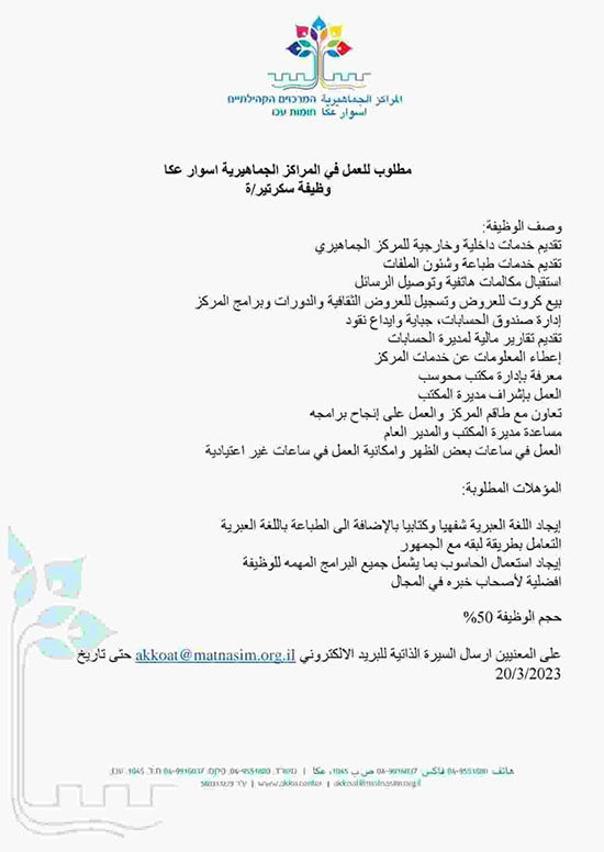 على المعنيين ارسال السيرة الذاتية للبريد الالكتروني akkoat@matnasim.org.il حتى تاريخ 20/3/2023