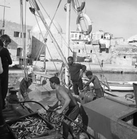 عكا… آخ على ايام زمان… صيادين على مراكبهم يعبئون الاسماك في ميناء عيسى العوام