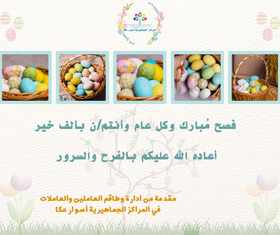تتقدم إدارة وطاقم العاملين والعاملات في المراكز الجماهيرية أسوار عكا بأسمى آيات التهاني وأعطرها لكل المحتفلين والمحتفلات في عيد الفصح المبارك، عسى أن يعود علينا بالخير واليُمن والبركات وبأحسن الأحوال.