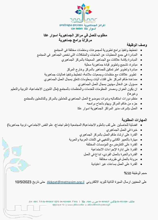 مطلوب للعمل في مراكز الجماهيرية اسوار عكا