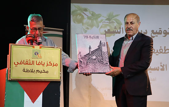 وتم تكريم الشاعر بدرع تكريمي قدّمه تيسير نصر الله وحسن عبادي (استلمته العائلة نيابة عنه) كما وقع المحامي حسن عبادي ورئيس مركز يافا تيسير نصر الله الكتاب للحضور.