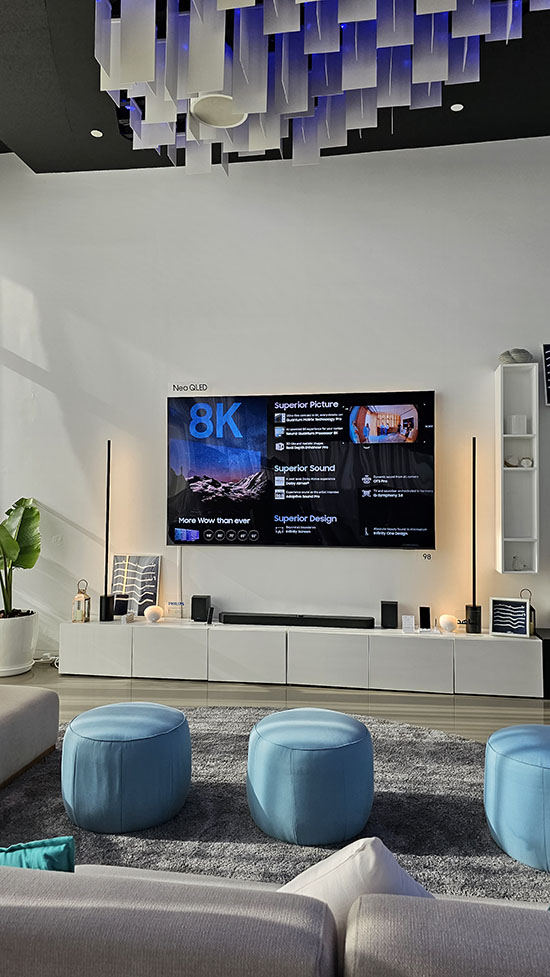 وابتداءً من غرفة المعيشة، تمكّن ضيوف سامسونج من تجربة أفضل محتوى عربي عبر منصة “شاهد” باستخدام تلفزيون Neo QLED بحجم 98 بوصة، والذي يحوّل الغرفة فوراً إلى قاعة سينما منزلية. يستخدم هذا التلفزيون تقنية Neo QLED 4K المزودة بميزة Quantum Mini LED التي تنتج مليار لون مع تباين عالٍ ومناطق إضاءة أكثر بـ 1.5 مرة من تقنية Quantum Matrix من سامسونج. وتكتمل هذه التجربة بصوت نابض مع تقنية الصوت المحيطي Dolby Atmos، وتكنولوجيا تتبع الصوت المتطورة Object Tracking Sound Pro، ونظام Symphony 3.