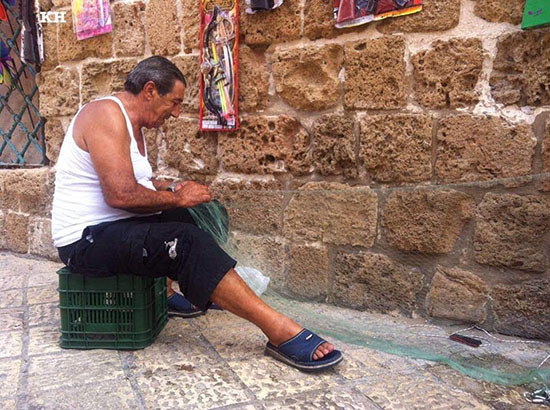عكا… المرحوم خميس زكور خلال عمله في تصليح وحياكة شباك الصيد