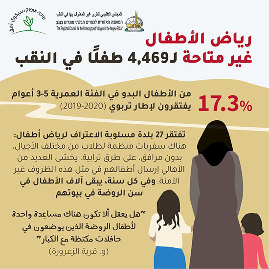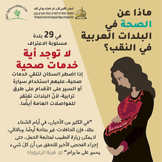 أما يوليا كوسمان- جلعاد، مركزة مجال المساواة في النقب في جمعية سيكوي- أفق تقول في تعليقها على المخطط” بدلا من وضع خطة جديدة دون مشاركة السكان العرب، يجب معالجة الضوائق الحقيقية في حياتهم: يفتقر أكثر من 100,000 مواطن لخدمات تعليم وصحة ورفاه لائقة، وذلك على الرغم من وجود حل قانوني وقابل للتطبيق يتيح المجال لتقديم هذه الخدمات في القرى مسلوبة الاعتراف: مراكز خدمات- مبان مؤقتة في مراكز القرى حيث يمكن إقامة عيادات صحية، رياض أطفال ومدارس وتقديم خدمات رفاه أساسية. يطرح هذا الموضوع مرارا وتكرارا في لجان الكنيست، والقرارات الخماسية (القرار 1279 على سبيل المثال) شملت بنودا تتيح إقامة وتطوير مراكز كهذه، ولكن التقدم الذي أحرز في السنوات الأخيرة بسيط جدا ولن يساهم في تقليص الفجوات وفي تغيير الواقع الصعب في قرى النقب. هل تعرف وزارة الرفاه ما عدد العائلات المحتاجة التي لا تتلقى أي خدمات من الوزارة في القرى مسلوبة الاعتراف؟ هل تعرف وزارة الصحة كمْ امرأة حاملا لا تتابع حملها وفقا للتوجيهات؟ على وزارة الصحة، وزارة التربية والتعليم ووزارة الرفاه فهم احتياجات السكان بشكل معمق والسعي لإيجاد حلول ملائمة وإتاحة الخدمات الأساسية بشكل فوري لجميع السكان.وتؤكد يوليا أيضا أن كل هذا لا يعفي سلطة تطوير وتوطين العرب- البدو في النقب ودائرة التخطيط اللوائية من مسؤوليتهما حيال تلبية احتياجات سكان القرى مسلوبة الاعتراف. طرحت منذ فترة طويلة على طاولة دائرة التخطيط خطة شاملة لإقامة مراكز خدمات تلبي هذه الاحتياجات، ونحن نطالب بتنفيذ هذه الخطة “.