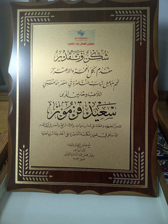 علم مراسل عكانت وفي لفتة جميلة من قبل مجلس عمال الناصرة حيث قاموا بتكريم نجوم “هبوعيل شباب الناصره” ومن ضمن من كرم النجم العكي من ايام العز وايام الزمن الجميل لشباب الناصره حارس المرمى الاسطوري الكابتن سعيد قزموز (ابو خالد).