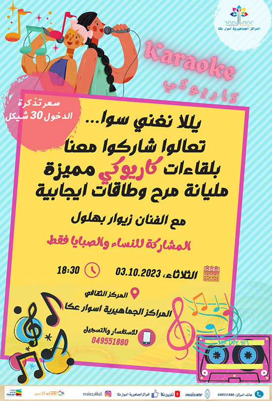 تدعو المراكز الجماهيرية أسوار جمهور النساء للمشاركة بلقاء الكاريوكي المقبل، والتمتع بالأجواء الفنية المليئة بالمرح والطاقات الإيجابية، الذي سيقام في المركز الثقافي العكي، الثلاثاء 3.10 عند الساعة 18:30، بمرافقة الفنان زيوار بهلول.