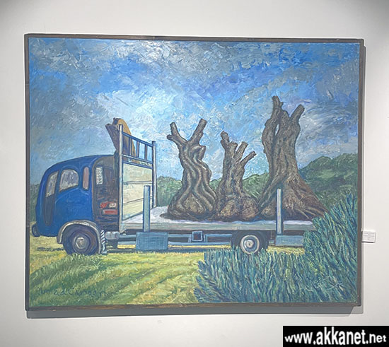 لا بدّ لي من عودة إلى لوحة “نقل أشجار زيتون عتيقة“؛ حيث يتمّ اقتلاعها عنوةً من قرانا المهجّرة، وكذلك المسكونة في الضفّة الغربيّة، ونقلها إلى بؤر استيطانيّة ومستعمرات في الداخل الفلسطينيّ لمحو الهويّة الفلسطينيّة من الحيّز والتخلّص منها وفبركة التاريخ وتجييره، قولًا وفعلًا. فاجتثاث الزيتون ونقله واضح وجليّ للإسراع في تهويد المعالِم من أجل صياغة صورة جديدة وخلق حيّز يهوديّ للمكان من خلال الاقتلاع والتجريف كي لا تبقى تلك الأشجار شاهدًا على تلك الجريمة النكراء وعلى التطهير العرقيّ المقيت لفلسطين.